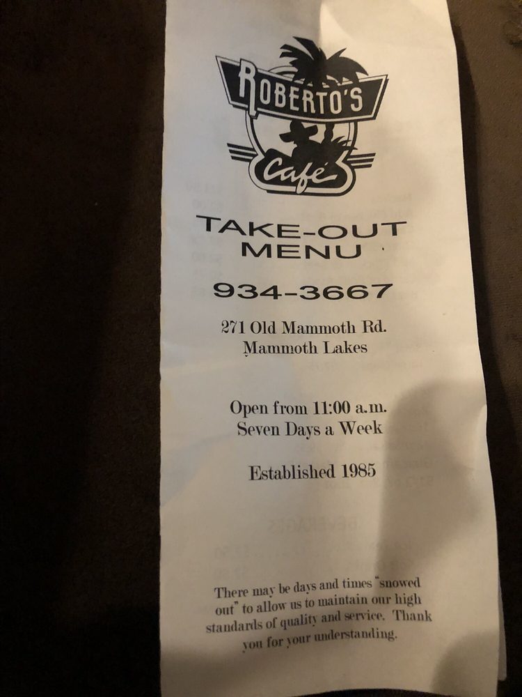 Located in Mammoth Lakes, CA, Roberto’s Cafe offers a unique dining experience that combines the comfort of a lounge with the excitement of a sports bar and the flavors of Mexican cuisine. With various utilities such as takeout, delivery, and vegan options, Roberto’s Cafe caters to a diverse range of diners. The restaurant is wheelchair accessible, with ADA-compliant facilities and QR code menus available for convenience. Enjoy a casual atmosphere with outdoor seating, a full bar, and happy hour specials on Thursday, Friday, and Saturday nights. Whether you're looking for a place to relax with friends, enjoy a family meal, or even host a private event, Roberto’s Cafe has something for everyone. Don't miss out on their delicious dishes and welcoming ambiance that will make you feel right at home.